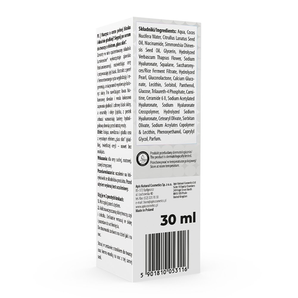 Marzysz o cerze pełnej blasku i idealnie gładkiej? Sięgnij po serum do twarzy z efektem „glass skin”. Zawarty w nim opatentowany składnik Luminescine® wykorzystuje zjawisko fotoluminescencji, rozświetlając cerę i przywracając jej blask. Ekstrakt z pereł i fermentowanego ryżu wygładzają i regenerują, a niacynamid wyrównuje koloryt skóry. Trio nawilżające: kwas hialuronowy, skwalan i woda kokosowa zapewnia gładkość i zdrowy blask skóry, a ceramidy i oleje (jojoba, z pestek arbuza) wzmacniają barierę hydrolipidową chroniąc przed utratą wody.