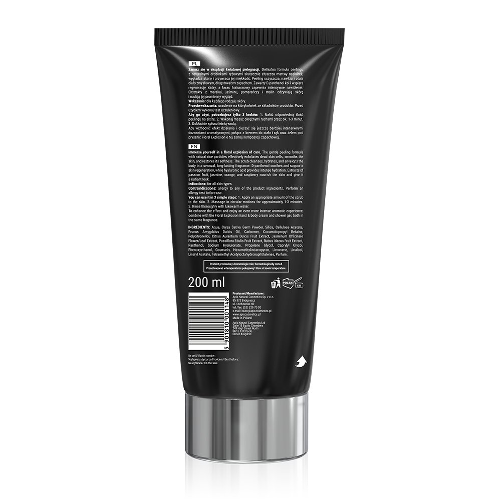 Delikatna formuła peelingu z naturalnymi drobinkami ryżowymi skutecznie złuszcza martwy naskórek, wygładza skórę i przywraca jej miękkość. Peeling oczyszcza, nawilża i otula ciało zmysłowym, długotrwałym zapachem. Zawarty D-panthenol koi i wspiera regenerację skóry, a kwas hialuronowy zapewnia intensywne nawilżenie. Ekstrakty z marakui, jaśminu, pomarańczy i malin odżywiają skórę i nadają jej promienny wygląd.