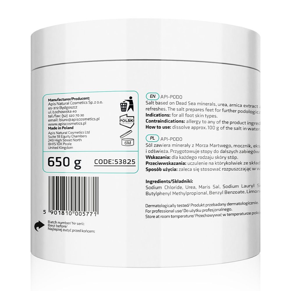 Salt based on Dead Sea minerals, urea, arnica extract and water lily. The product perfectly softens calloused skin of the feet, cleanses and refreshes. The salt prepares feet for further podological treatments.